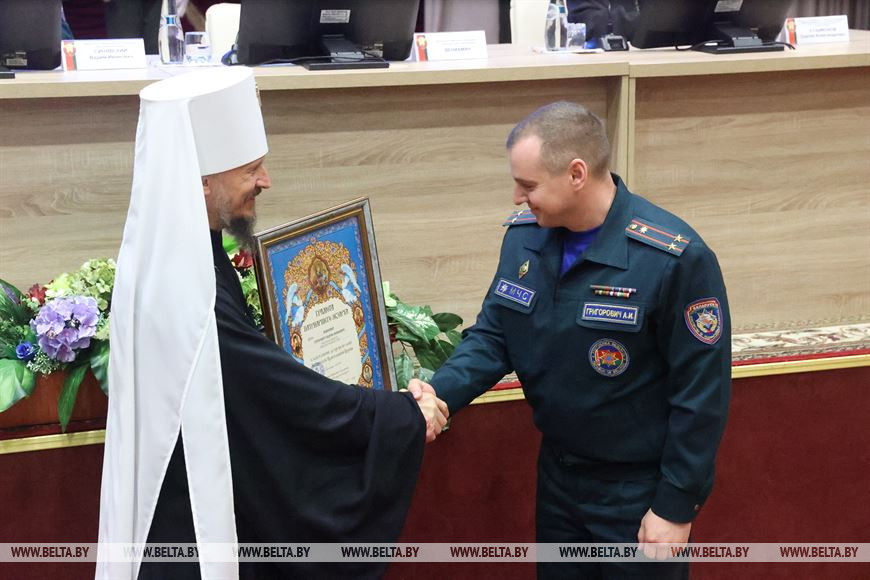 30 ноября, Минск /Корр. БЕЛТА/. Взаимодействие Белорусской православной церкви и МЧС складывается из двух составляющих - работы с личным составом и с гражданским населением. Об этом заявил Митрополит Минский и Заславский, Патриарший Экзарх всея Беларуси Вениамин во время Республиканского семинара по вопросу реализации соглашения о взаимодействии органов, подразделений и организаций системы МЧС с Белорусской православной церковью, передает корреспондент БЕЛТА.