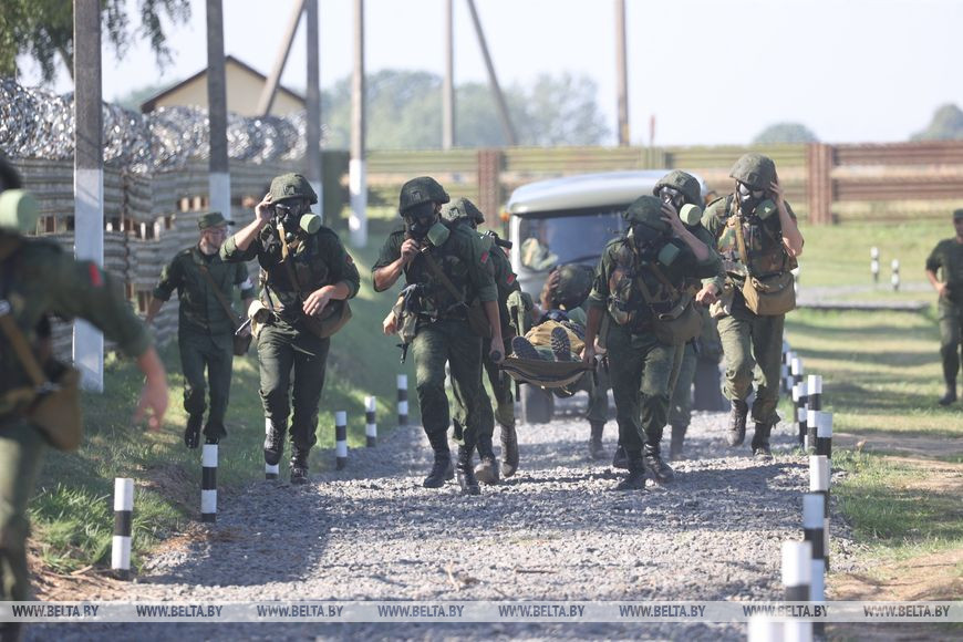 Но на этом второй этап "Стальной магистрали" не заканчивался. После успешной сборки понтона командам в полном составе предстояло пробежать 300 м. Когда участники преодолевали этот отрезок пути, им было необходимо надеть противогазы, пройти через участок "зараженной" местности и на носилках доставить своего товарища к финишной линии. С учетом невыносимо жаркой погоды эта задача была совсем непростой. Тем не менее и белорусские, и российские военнослужащие успешно ее выполнили. Правда, у российской команды возникли непредвиденные трудности: уже после доставки первой секции понтона толкач сел на мель и участники потеряли драгоценные минуты.