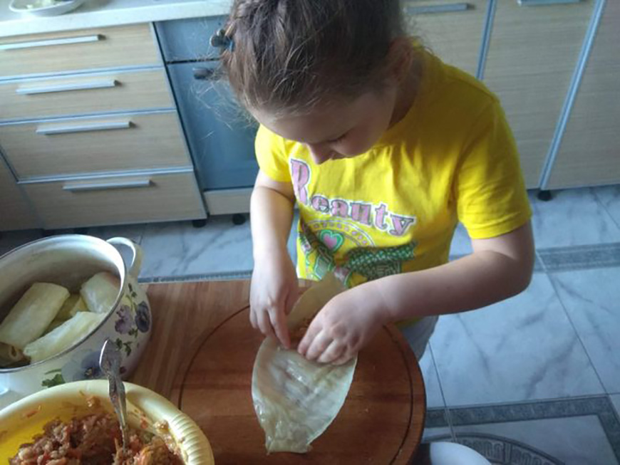 "Мне готовить в удовольствие. К тому же мне кажется, что домашняя кухня - тоже такой важный объединяющий фактор. Люблю, когда все вместе собираются за столом, когда мои блинчики с черничным вареньем моментально разлетаются", - признается мама. Помогают и интересуются готовкой и дети. Например, Дима может сам найти рецепт, что-то испечь.