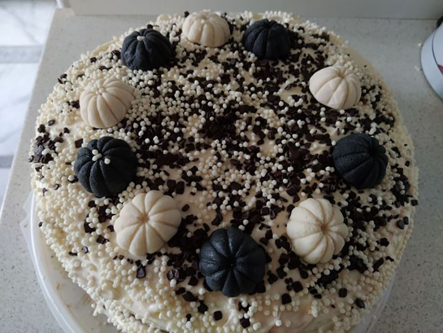 Из горячих коржей Марина составляет торт, декорирует угощение, которое станет украшением праздничного стола ко Дню матери.