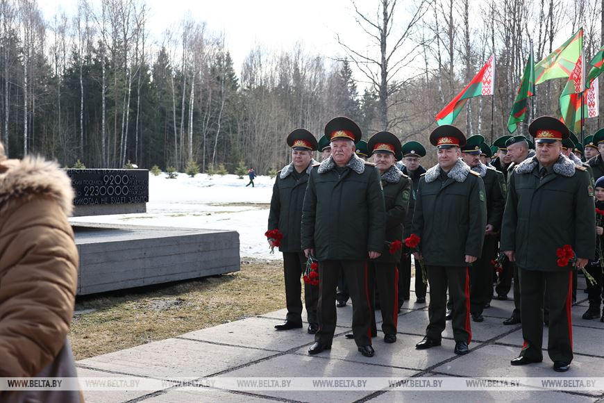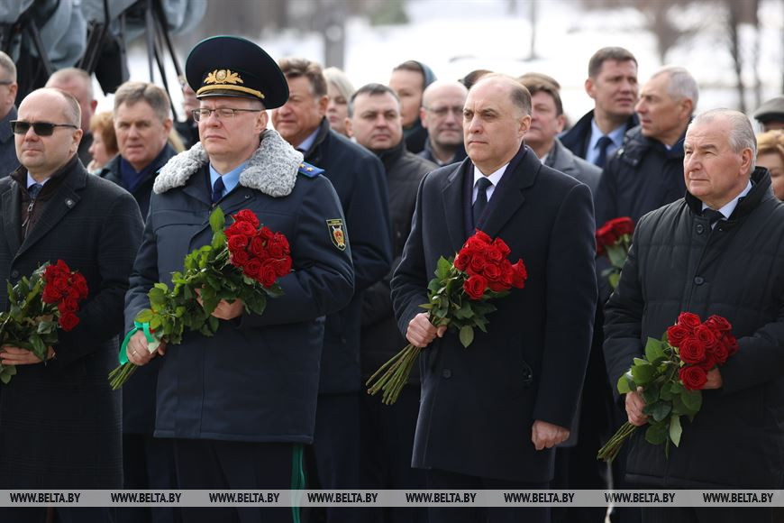22 марта, Логойский район /Корр. БЕЛТА/. Руководящий состав и сотрудники силового блока возложили цветы в мемориальном комплексе "Хатынь" по случаю 80-летия трагедии, передает корреспондент БЕЛТА.