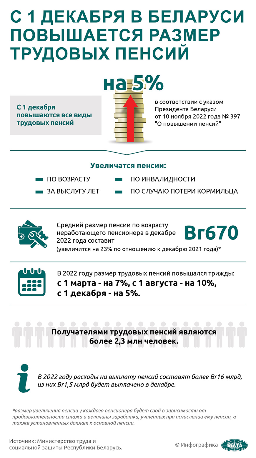 Как рассказали в Минтруда, соответствующее решение принято согласно указу Президента от 10 ноября 2022 года №397 "О повышении пенсий". "Согласно перерасчету размер трудовой пенсии увеличится на 5%. И это третье повышение трудовых пенсий в 2022 году. Ранее эти выплаты повышались в марте - на 7% и в августе - на 10%. Средний размер пенсии по возрасту неработающего пенсионера в декабре 2022 года составит Br670", - рассказали в Минтруда.