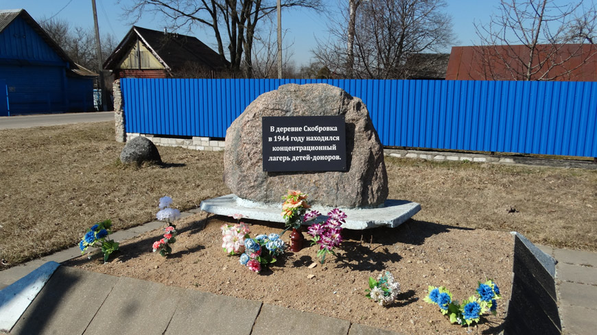 В центре села, на перекрестке, памятник - валун с черной плитой, на которой надпись: "В деревне Скобровка в 1944 году находился концентрационный лагерь детей-доноров". Сразу бросается в глаза - мемориал досмотрен: ограда окрашена, яркие пластиковые цветы украшают пространство вокруг памятного камня.