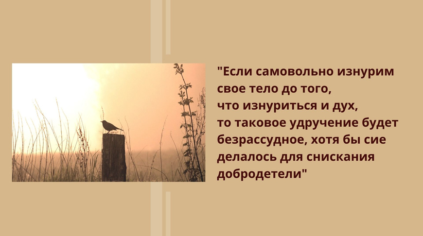 Употребил ли ты пищи много или сделал другое что сродное слабости человеческой, не возмущайся сим, не прибавляй вреда ко вреду; но, мужественно подвигнув себя к исправлению, старайся сохранить мир душевный, по слову Апостола: блаженъ не осуждаяй себе, о немже искушается (Рим. 14, 22).