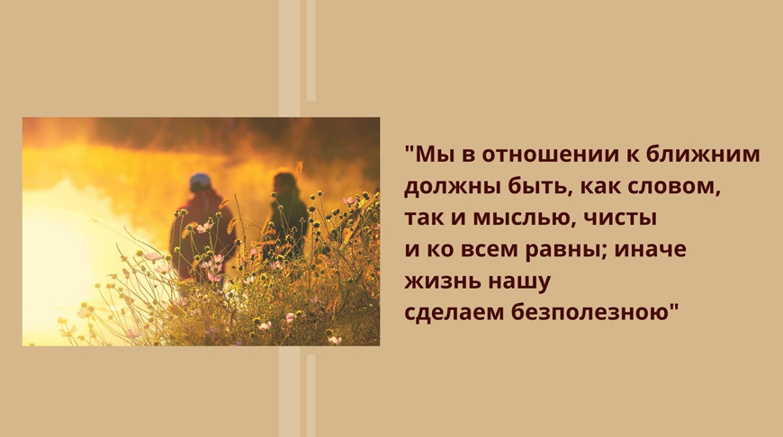 Всеми мерами надобно стараться, чтоб сохранить мир душевный и не возмущаться оскорблениями от других; для сего нужно всячески стараться удерживать гнев и посредством внимания ум и сердце соблюдать от непристойных движений.
