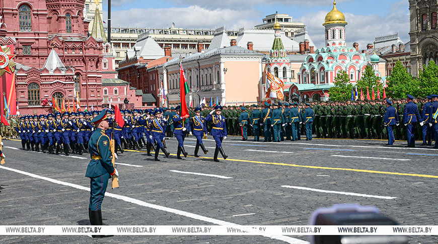 По Красной площади вместе строю с российскими парадными расчетами маршировали офицеры, сержанты и солдаты воинских контингентов от вооруженных сил Республики Беларусь, Республики Казахстан, Кыргызской Республики и Республики Таджикистан. Последовательность их прохождения определялась алфавитным порядком.