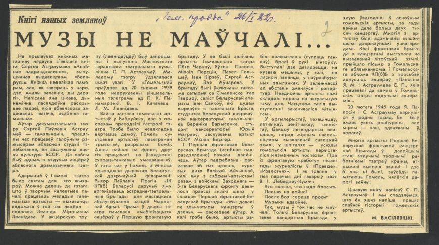 "От Гомеля до Германии с ними прошел один автобус, который они называли "люкс". В этом автобусе летом стояла невыносимая жара, зимой он покрывался инеем. Артисты толкали автобус, когда тот увязал в грязи или песчаных заторах. Если перегревался двигатель, то нужно было искать воду. Ее набирали где-то в поле, а потом еще и пили эту воду, процеживая носовыми платками", - отмечает Ольга Брилон.В фонде Прагина можно найти книгу "Особое подразделение", которую после войны написал один из членов бригады Сергей Остроумов. Вышла она в издательстве "Беларусь" в 1982 году. Там рассказывается о жизни и работе обычных артистов, подробно описаны их будни и сложные моменты, которые приходилось переживать вместе.