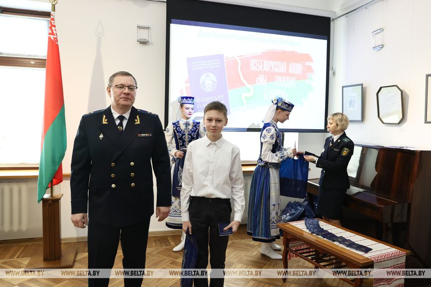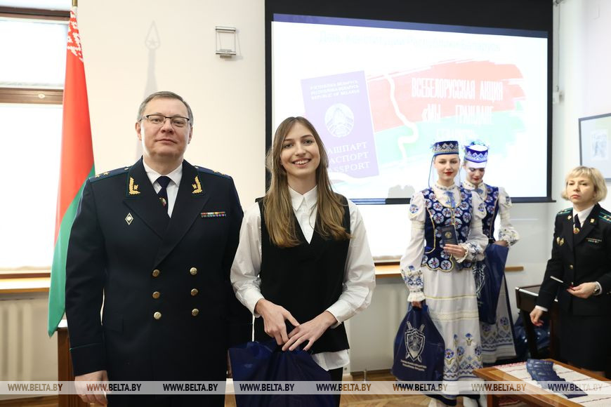 Генпрокурор подчеркнул, что молодому поколению вручается важный документ, удостоверяющий личность. "Но он не только будет удостоверять вашу личность, он будет еще раз подчеркивать, что вы - граждане нашей страны. Когда откроете этот документ, вы увидите, что паспорт является собственностью Беларуси и что вы находитесь под защитой республики", - отметил он.