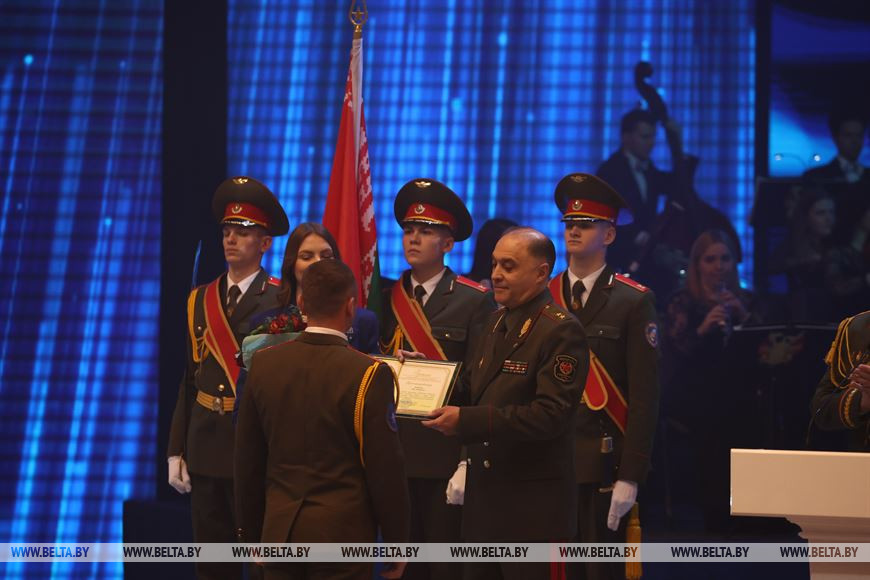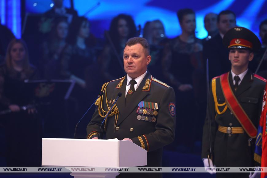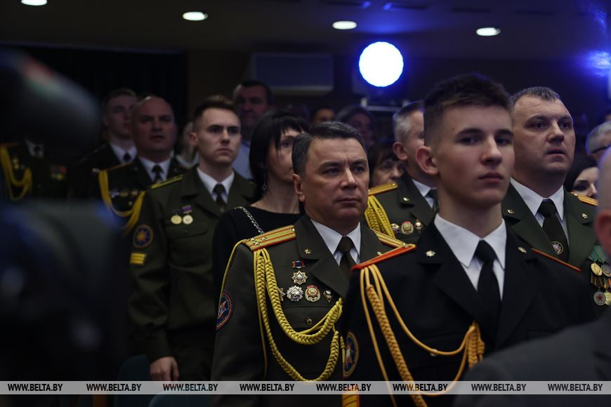 Во время торжественного мероприятия государственный секретарь Совета безопасности огласил поздравление Президента Беларуси и вручил заслуженные награды работникам МЧС.