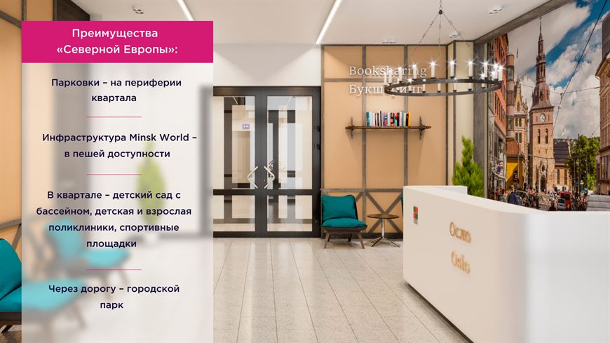 Квартал "Северная Европа" сочетает в себе комфорт городской жизни и экологичность загородной. Вся инфраструктура комплекса, в том числе детская и взрослая поликлиники, будет в пешей доступности, внутри квартала запроектирован детский сад, игровые и спортивные площадки, зоны отдыха и выгула домашних животных. Здесь будет много деревьев, кустарников и цветов, а через дорогу – шикарный парк – "зеленое" сердце проекта.
