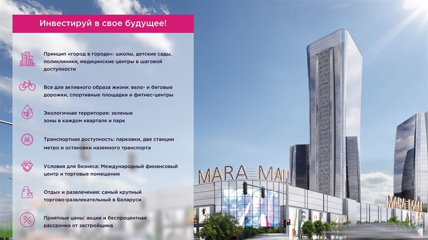 Minsk World энергично застраивается и совсем скоро здесь будет все, что нужно для активной и комфортной жизни в мегаполисе. Сердцем комплекса станет Международный финансовый центр и крупнейший в стране торгово-развлекательный центр Mara Mall. Здесь появятся сотни рабочих мест и возможностей развивать собственное дело.