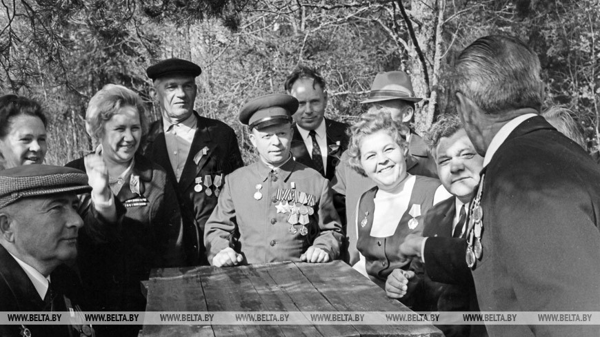 31 мая 1972 года. Бывшие партизаны делятся воспоминаниями. В центре - кавалер 3-х орденов Славы П. Рубис - разведчик-подрывник бригады им. Сталина отряда Калинина. Фото Альфреда Церлюкевича.