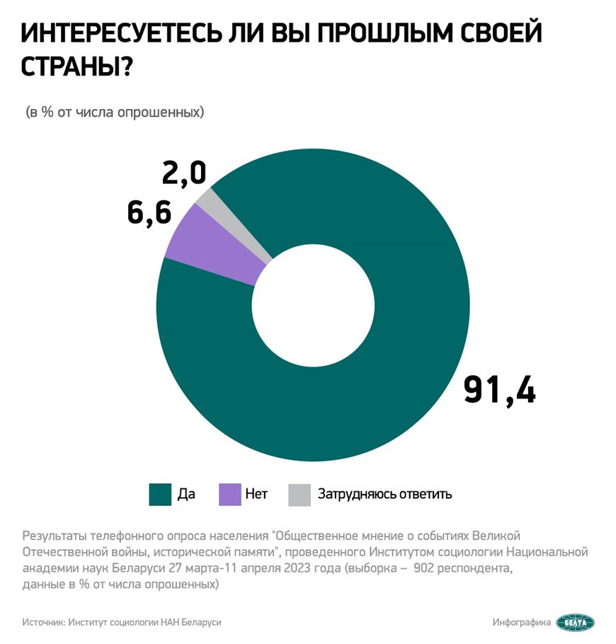 Институт социологии Национальной академии наук Беларуси провел с 27 марта по 11 апреля 2023 года телефонный опрос населения "Общественное мнение о событиях Великой Отечественной войны, исторической памяти". Выборка - 902 респондента.