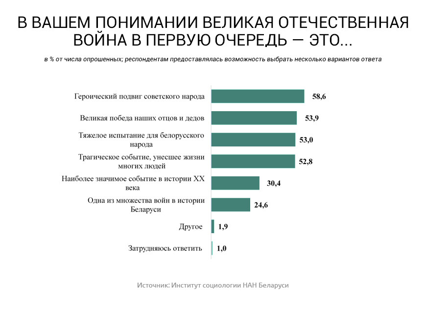 "Героический подвиг советского народа" - так ответили 58,6% опрошенных, "Великая Победа наших отцов и дедов" - 53,9%, "Тяжелое испытание для белорусского народа" - 53%, "Трагическое событие, унесшее жизни многих людей" - 52,8%, "Наиболее значимое событие в истории ХХ века" - 30,4%, "Одна из множества войн в истории Беларуси" - 24,6%.