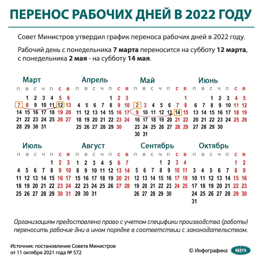 12 октября, Минск /Корр. БЕЛТА/. Совет Министров утвердил график переноса рабочих дней в 2022 году. Соответствующее решение закреплено постановлением Совмина от 11 октября 2021 года №572, сообщили БЕЛТА в пресс-службе правительства.
