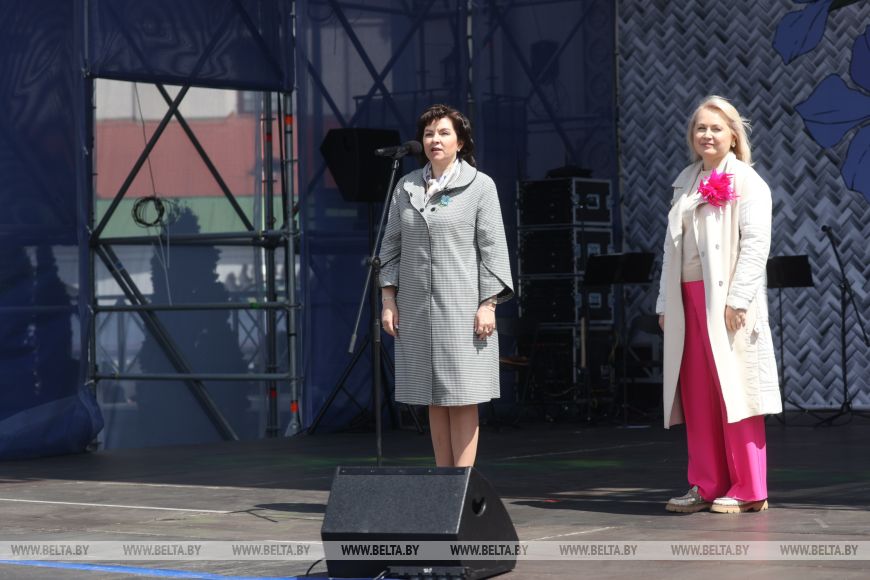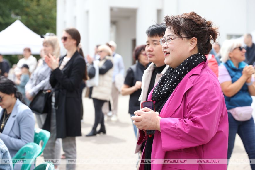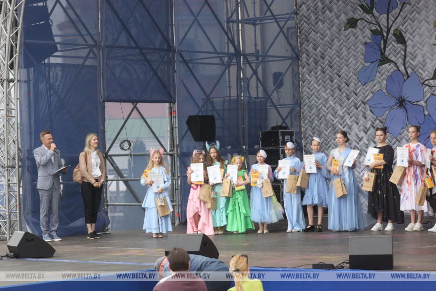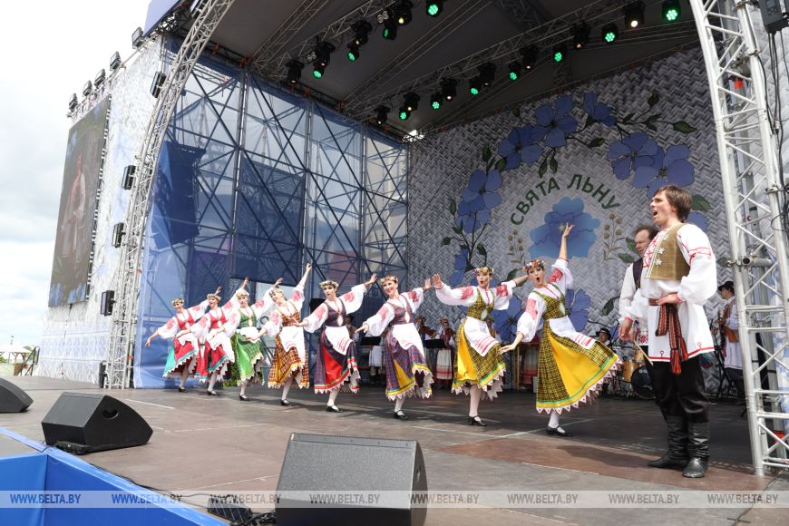 Продолжился фестивальный день выступлением Белорусского государственного академического заслуженного хореографического ансамбля "Хорошки". В красивых костюмах под музыку артисты рассказали о белорусских традициях, связанных со льном. В номерах они отобразили, как наши предки обрабатывали и использовали лен, как носили его каждый день и как украшали к праздникам.