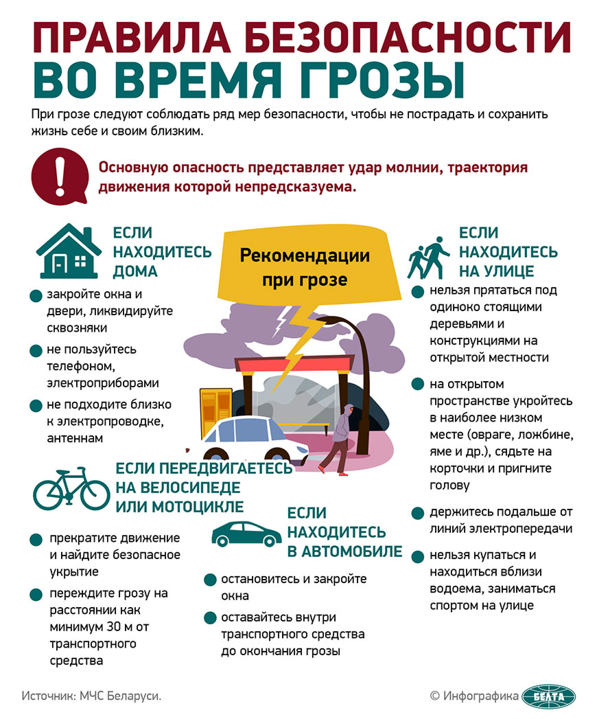 По данным Белгидромета, на сегодня в отдельных районах республики ожидаются грозы, в утренние часы местами туман. При подобных погодных условиях, напомнили спасатели, нельзя исключать такие факторы опасности, как повреждение (обрыв) линий связи и электропередачи, отключение электрических подстанций, электроэнергии в населенных пунктах. Вероятно возникновение лесных пожаров, а также пожаров в жилых и производственных зданиях. На дорогах - снижение видимости, затруднение движения транспорта, увеличение вероятности ДТП.