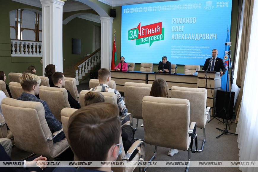 Сегодня в студенческую аудиторию пришел сенатор, председатель республиканского общественного объединения "Белая Русь" Олег Романов.