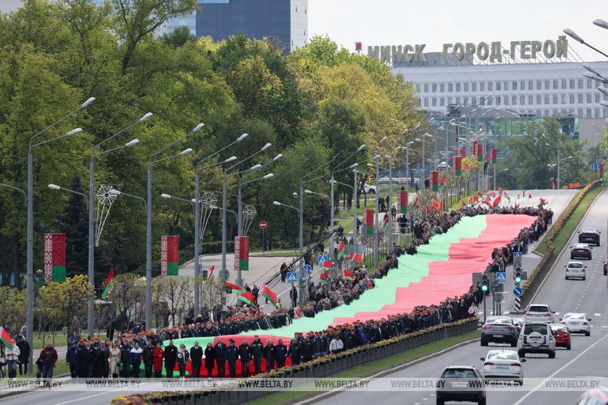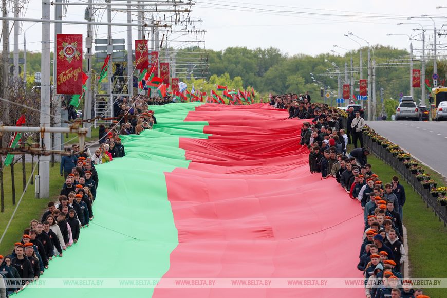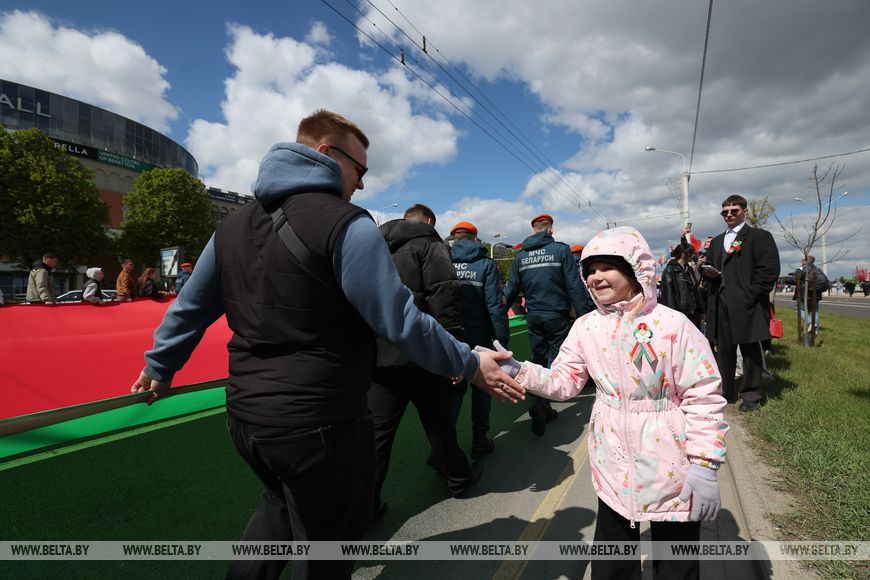 К этому моменту завершилась красивая акция, ставшая частью торжественного ритуала, - по Минску пронесли самый большой Государственный флаг Беларуси длиной в полкилометра. Шествие с самым большим флагом Беларуси стартовало от стелы "Минск - город-герой". Флаг по проспекту Победителей до площади Государственного флага пронесли одновременно более 700 человек. Хотя желающих поучаствовать в акции было гораздо больше.