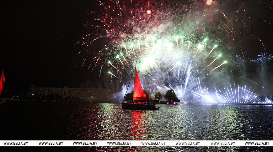 Изюминкой праздника стало водное шоу. Ведущие пригласили всех пройти к набережной реки Свислочь, где сначала появилось танцевально-световое шоу KRASILOV LIGHT SHOW. Затем началось пиротехническое шоу, под залпы которого по водной глади прошел корабль с алыми парусами. На нем находился главный художник праздника Юрий Борисевич. "Река в этом месте не обладает той глубиной, чтобы по ней мог пройти большой крейсер. Для этого главный художник вместе с архитекторами разработали специальный корабль, который может даже на неглубокой реке Свислочь плыть и маневрировать. Мало того, у судна паруса могут быть разного цвета. Юрий Борисевич также разработал всю сцену и даже те прекрасные разноцветные кувшинки, которые красиво зажигаются в воде", - проинформировала главный режиссер "Самого лучшего выпускного".