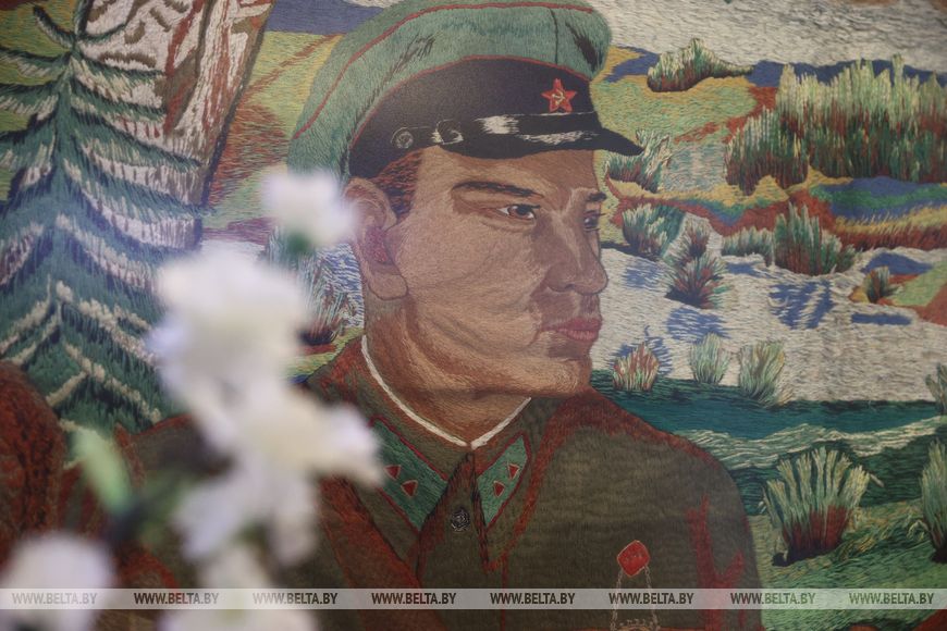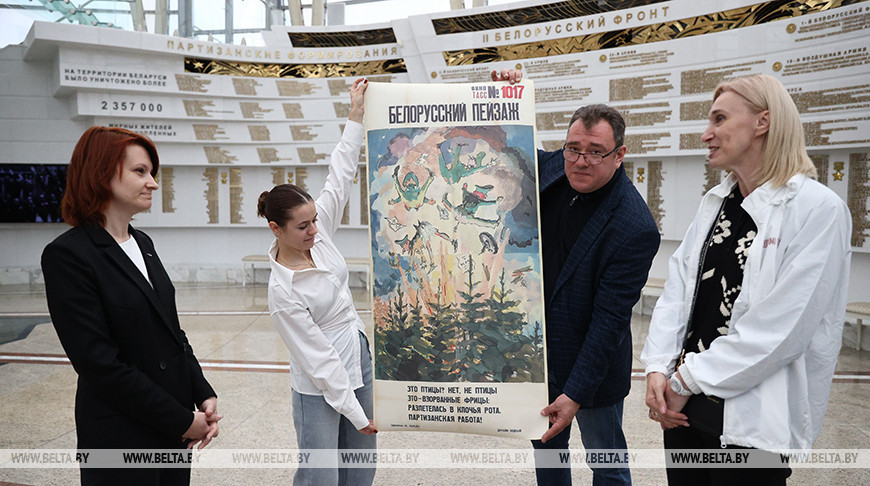 Когда началась война, в ТАСС было принято решение выпускать плакаты в поддержку советских воинов. Так появилась знаменитая серия "Окна ТАСС". Копию одного из плакатов сегодня передали музею. Он называется "Белорусский пейзаж" и был выпущен в 1944 году художником Лебедевым.