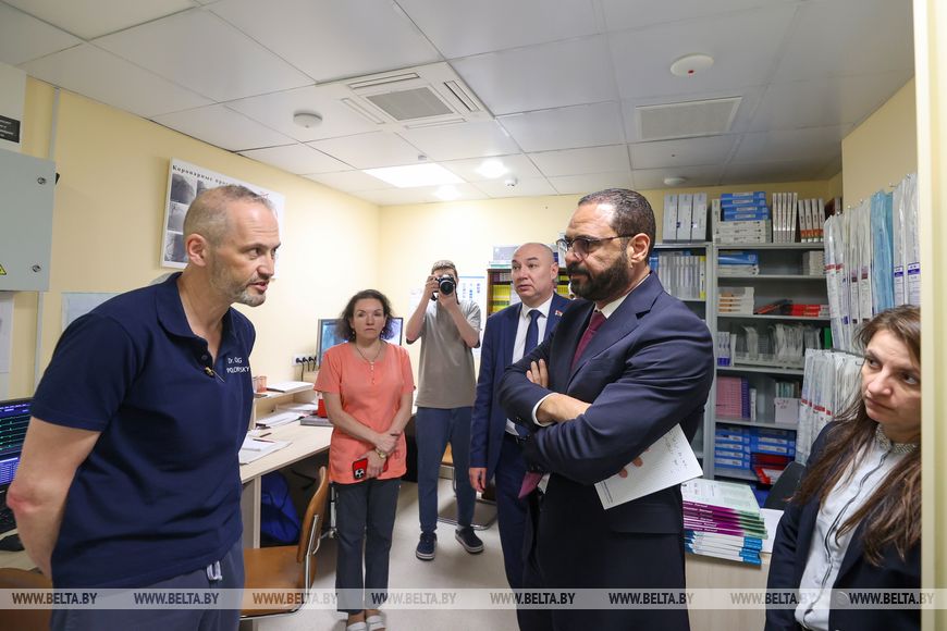 Потом после посещения рентгенэндоваскулярного отделения гостя ознакомили с гибридным корпусом, где продемонстрировали гибридную операционную, в которой выполняются гибридные вмешательства на сердце, то есть когда эндоваскулярный хирург и кардиохирург работают в одной бригаде. Такие операции считаются также довольно уникальными.
