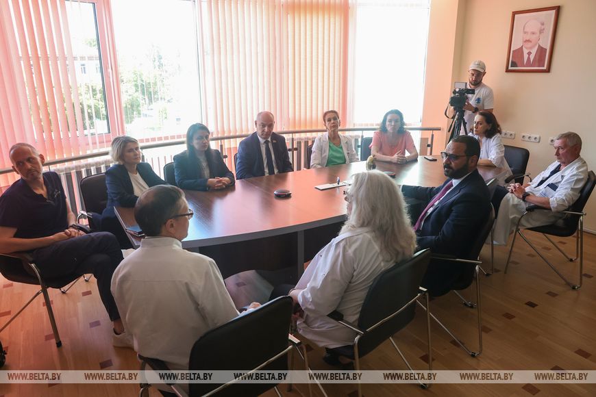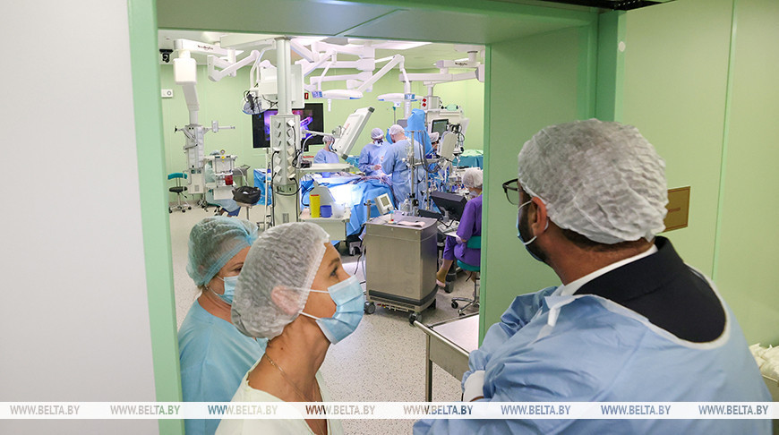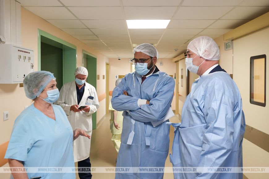 Потом после посещения рентгенэндоваскулярного отделения гостя ознакомили с гибридным корпусом, где продемонстрировали гибридную операционную, в которой выполняются гибридные вмешательства на сердце, то есть когда эндоваскулярный хирург и кардиохирург работают в одной бригаде. Такие операции считаются также довольно уникальными.