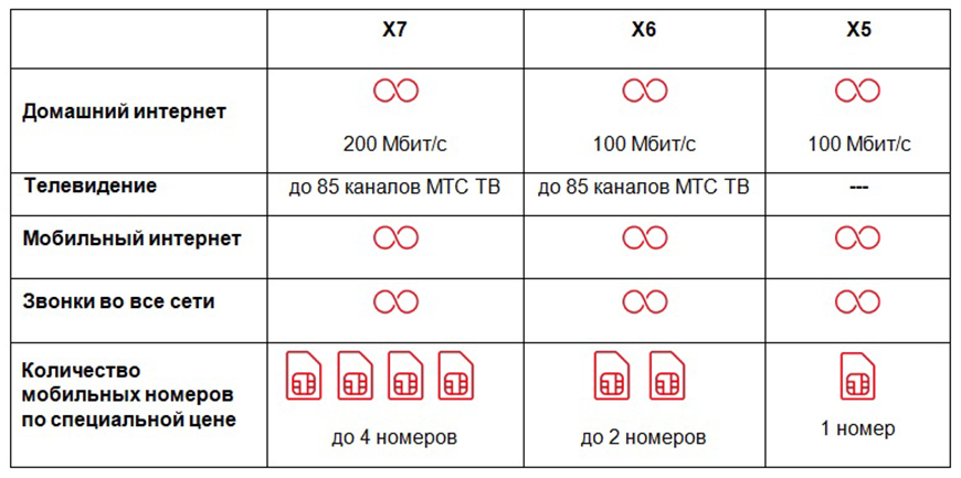 Линейка "ИКС" от МТС включает в себя услуги "Х5", "Х6" и "X7" – это интернет на скорости до 200 Мбит/сек без ограничений по объему трафика. В абонентскую плату тарифов "X6" и "X7" включены 85 каналов сервиса МТС ТВ, а также возможность установки антивирусов для компьютеров и смартфонов: "X6" предоставляет по одному лицензионному ключу для персонального и мобильного гаджетов, а "X7" – для трех компьютеров и трех сматфонов.