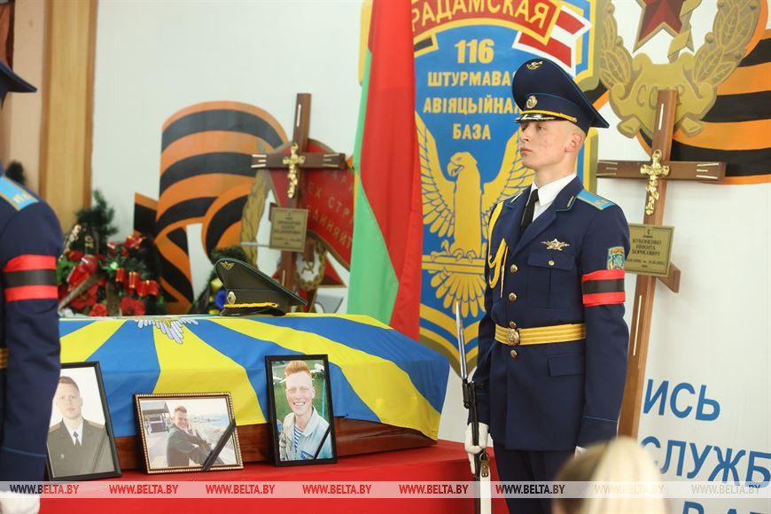 Церемония прощания прошла в клубе 116-й штурмовой авиабазы, где служили майор Андрей Ничипорчик и лейтенант Никита Куконенко. Накануне их тела по воздуху доставили из Барановичей.