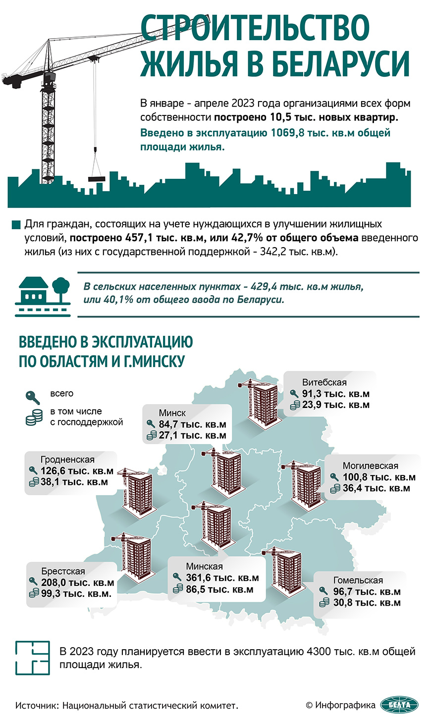 19 мая, Минск /Корр. БЕЛТА/. Организации всех форм собственности в Беларуси в январе - апреле построили 10,5 тыс. квартир, введено в эксплуатацию 1 069,8 тыс. кв.м жилья, сообщили БЕЛТА в Национальном статистическом комитете.