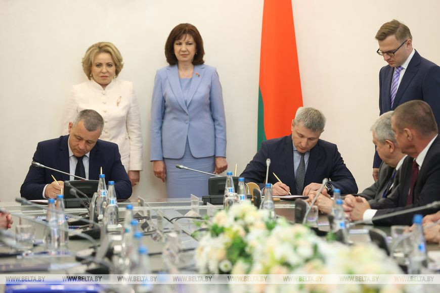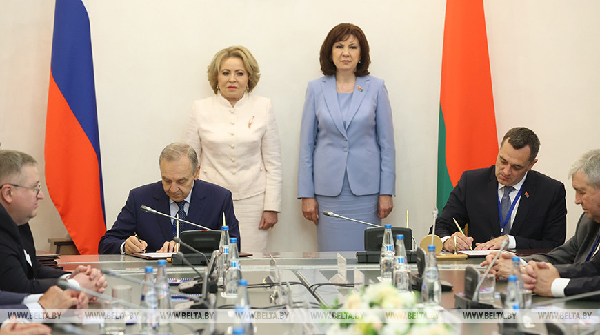 Церемония подписания документов завершила встречу председателей Совета Республики и Совета Федерации Натальи Кочановой и Валентины Матвиенко с руководителями органов государственной власти регионов Беларуси и субъектов РФ.
