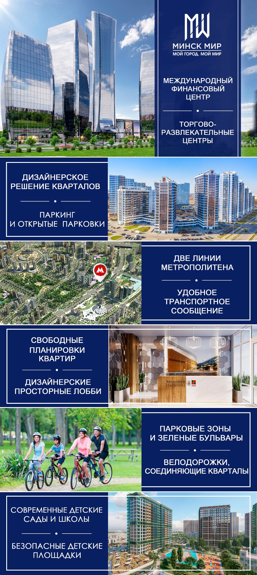 Более 340 гектаров жилой, коммерческой и общественной недвижимости практически в центре Минска. Современные красивые новостройки с площадками для спорта и отдыха прямо во дворе. Развитая инфраструктура, включающая школы, детские сады, магазины и метро в шаговой доступности. Все это – Minsk World, самый масштабный многофункциональный комплекс в Европе!