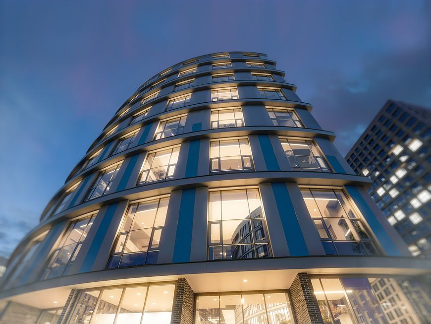 Для торцевых квартир предусмотрена еще одна небольшая жилая комната и окно в кухонной зоне над рабочей поверхностью на торцевой стороне фасада.Дом "Сад Эрмитаж" имеет дугообразную форму для гармонизации архитектурных образов с живой природой - зелеными зонами на территории квартала. Цветовая гамма фасада решена в "чистых" белых и природных синих цветах. Остекление - тонированное синее. Оконные проемы под данные панорамные окна имеют высоту 4,4 м и ширину 3 м.