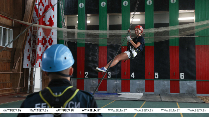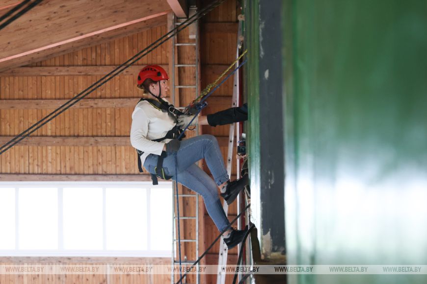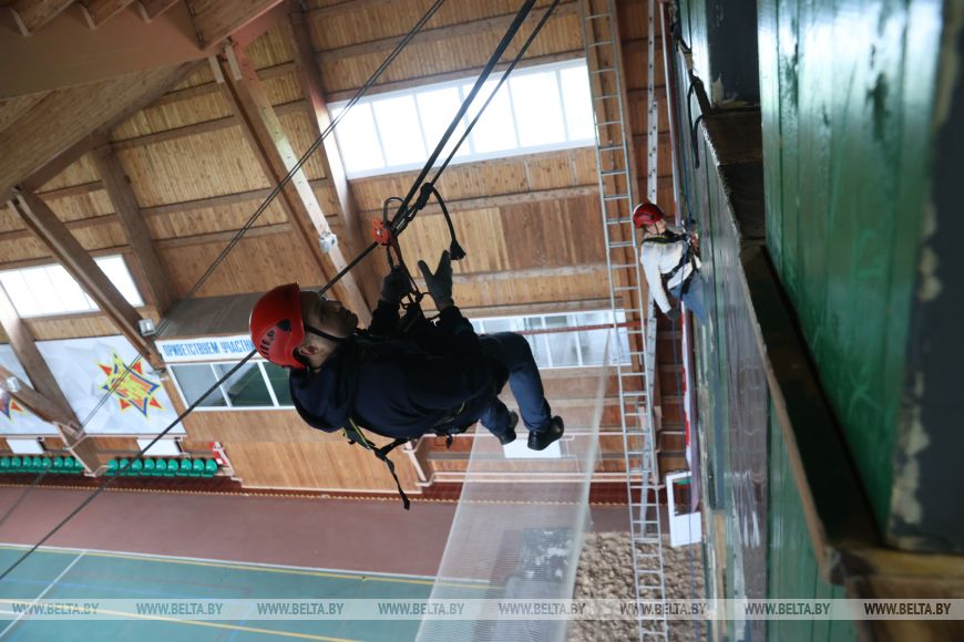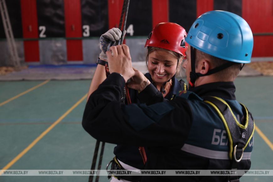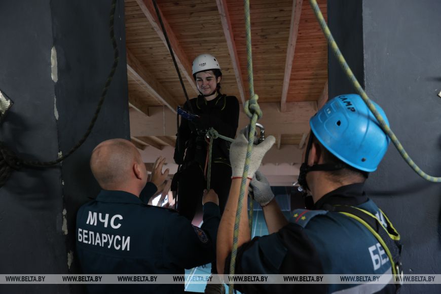 Оказав помощь всем, кому могли, мы отправились покорять этажи. И не просто подниматься, но и спускаться, как настоящие спасатели, по тросам. Всего нам дали попробовать два варианта: самоспасение и спуск с веревки.