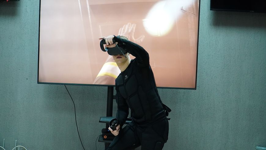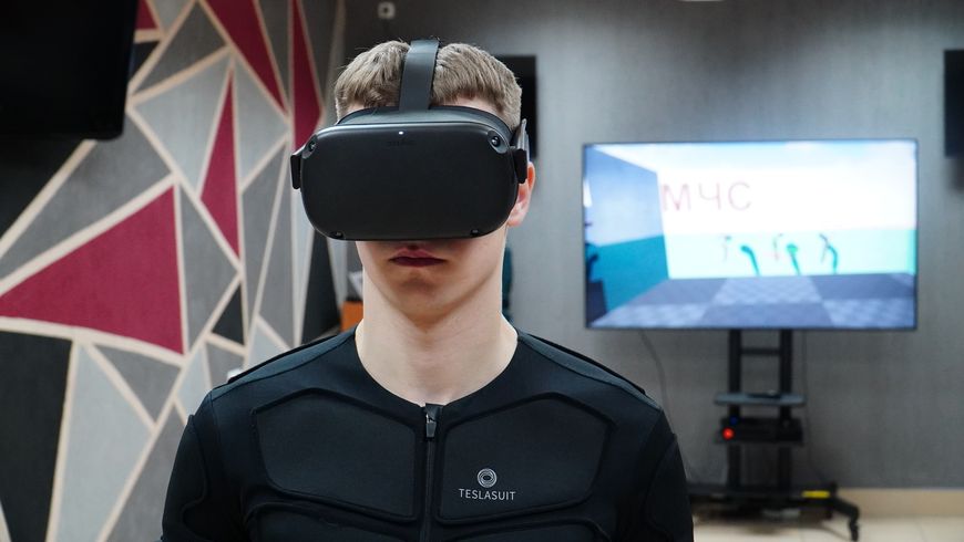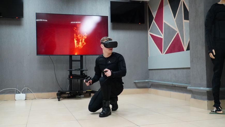 Со стороны мы словно наблюдаем за ходом видеоигры, но обучающийся ощущает себя в ситуации чрезвычайной опасности. VR-очки и костюм с обратной тактильной связью позволяют прочувствовать все нюансы пребывания в условиях пожара.