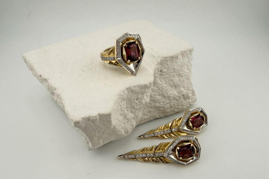 Авторская коллекция в стиле ар-деко Gatsby&Daisy уводит нас в эпоху 20-х годов ХХ века, времена бурного промышленного роста, богемных вечеринок, джаза и переосмысления женской роли в обществе. Массивные кольца и серьги, яркие, крупные камни, лимонное золото, нежные розовые турмалины и обтекаемые формы комплекта DAISY - как же все это страстно!
