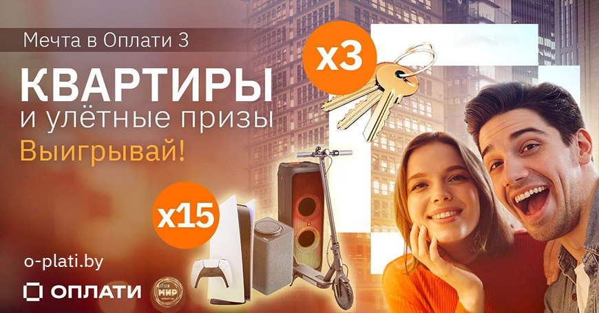 Каждый пользователь приложения Оплати™ становится участником рекламной игры "Мечта в Оплати 3"! Уже 10 декабря в 17:00 в прямом эфире радио "МИР" разыграют 5 акустических систем JBL PartyBox 1000 Bт. А вечером 24 декабря – главный приз – КВАРТИРУ в жилом комплексе Minsk World.