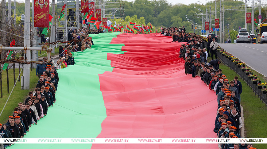 Сегодня Государственный флаг Республики Беларусь по проспекту Победителей до площади Государственного флага пронесли одновременно более 700 человек. Полотнище флага впечатляет - 500 м длиной и 9 м шириной. Вес - более 400 кг. Акцию организовали республиканское общественное объединение "Белая Русь" и Федерация профсоюзов Беларуси в рамках празднования Дня Государственного флага, Государственного герба и Государственного гимна Республики Беларусь.-0-