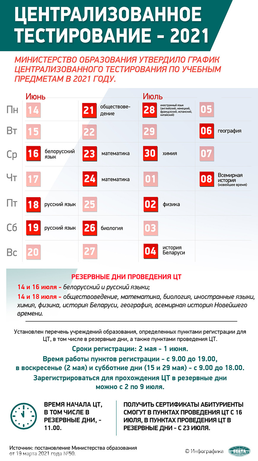В то же время в этом году есть и ряд новшеств. Так, до 15 июня продлены сроки выдачи абитуриентам пропусков для участия в ЦТ, на два дня продлен срок приема документов от абитуриентов в вузы на сельскохозяйственные специальности. Цифровизированы процессы регистрации для прохождения ЦТ, оплаты регистрационного взноса, информирования приемными комиссиями абитуриента о допуске к вступительным испытаниям и результатах зачисления.