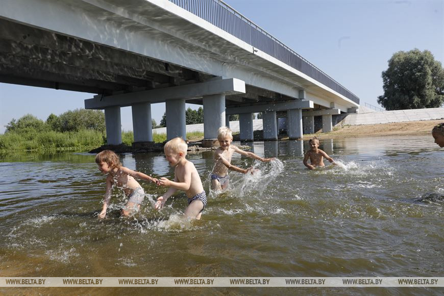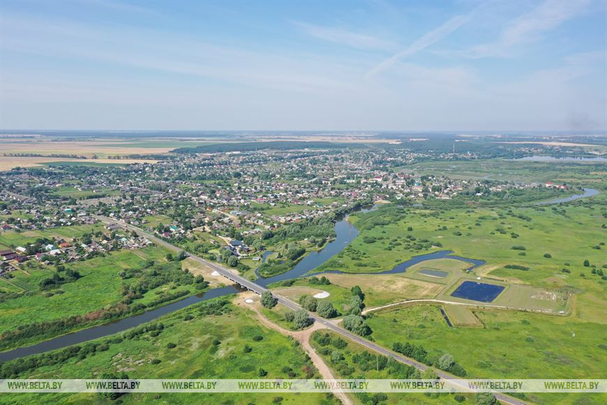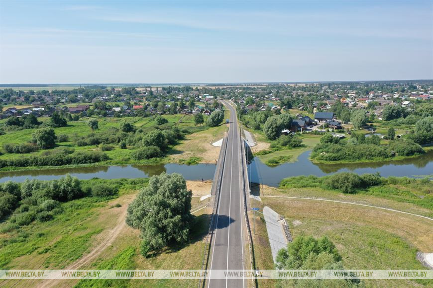Мы въезжаем со стороны деревни Тышковичи. Первой достопримечательностью становится недавно отремонтированный мост через реку Ясельда. Отсюда открывается один из лучших видов на Мотоль: ровная гладь реки, сочная зелень берегов, аккуратные домики в прибрежной зоне. Вдали в солнечных лучах переливается золотом купол местной церкви.