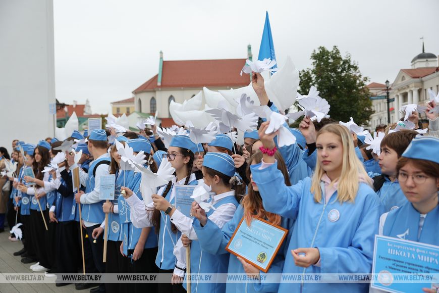 На Линейке мира были 700 юных миротворцев из всех 70 учреждений образования Минска, которые носят статус "Школа мира". Это четыре колледжа, четыре центра дополнительного образования детей и молодежи, 17 гимназий, 43 средние школы, два дошкольных учреждения. Республиканский проект Белорусского фонда мира "Сеть Школ мира в Республике Беларусь" реализуется совместно с Министерством образования.