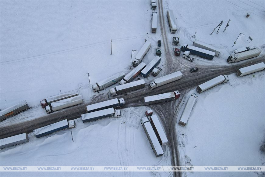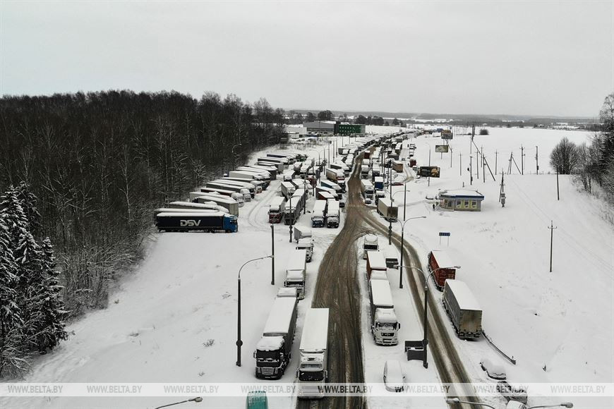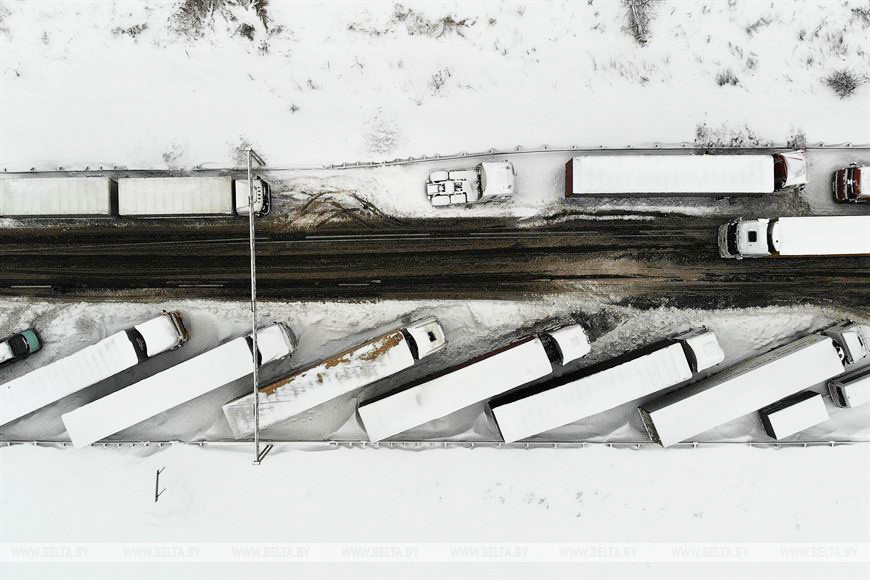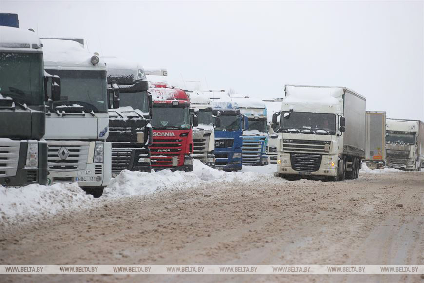 13 декабря, Ошмянский район /Корр. БЕЛТА/. Выезда из Беларуси в пункте пропуска "Каменный Лог" ожидают около 1,2 тыс. большегрузов, передает корреспондент БЕЛТА.