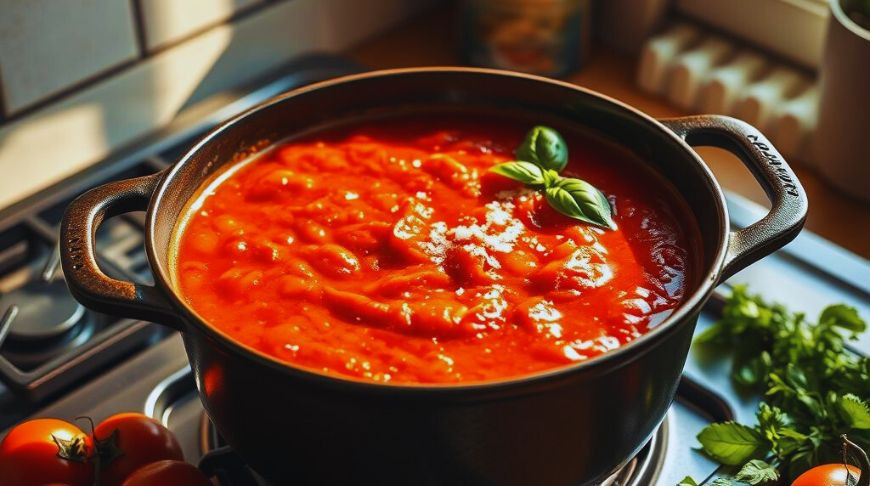 4. Приправляем соус. Добавьте щепотку сахара для баланса кислотности, а также соль, перец и сушеные травы. Оставьте на среднем огне и томите соус около 10 мин, чтобы он слегка загустел.
