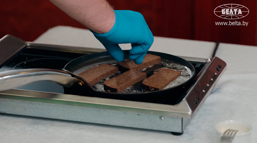 Приступаем к приготовлению гренок. Использовать будем бородинский хлеб. Он очень полезный, в нем есть клетчатка, витамины группы В, а также макро- и микроэлемены, такие как кальций, фосфор, цинк, железо, селен. Хлеб мы нарезаем (Маяковский был простым человеком, поэтому просто пополам) и обжариваем на сливочном масле до красивой корочки. А я добавлю, что бородинский хлеб улучшает состояние кожи, волос и ногтей, укрепляет сердце и сосуды, а также помогает справиться со стрессами.Маяковский, к слову, любил питаться просто, но полезно, критиковал роскошь и чревоугодие. В молодости поэту не хватало средств даже на еду, поэтому он часто ходил в гости. Даже систему разработал: установил семь "обедающих знакомств" и каждый день ел у кого-то из приятелей. Это наша третья вкусная тайна.