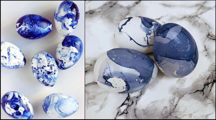 С помощью воска можно получить оригинальные орнаменты. Перед окраской яиц нанесите на их поверхность рисунок горячим воском. Когда краска высохнет, аккуратно удалите воск, и под ним останутся белые узоры.Мраморный эффект