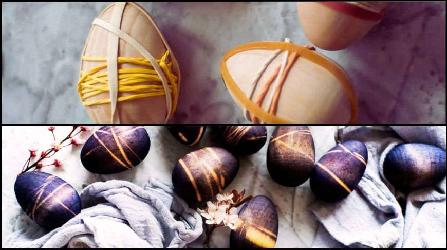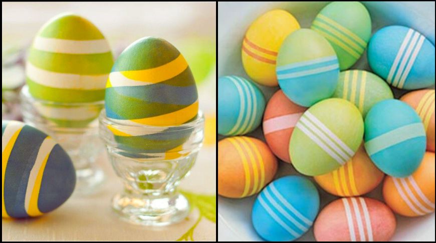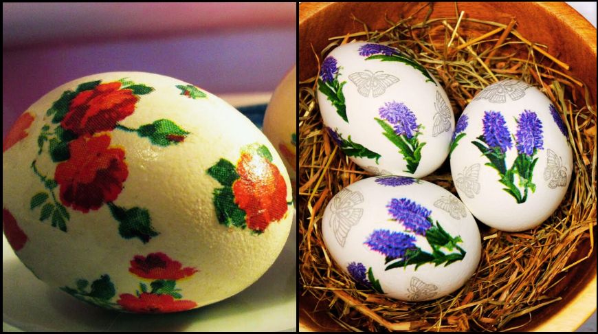 Для декупажа понадобятся салфетки и желатин. Замочите и разогрейте желатин, не доводя до кипения. Вырежьте нужный фрагмент салфетки, снимите верхний слой, положите его на яйцо и аккуратно нанесите желатиновый клей от центра к краям. После высыхания ваши яйца будут украшены оригинальными орнаментами.Полосатые узоры