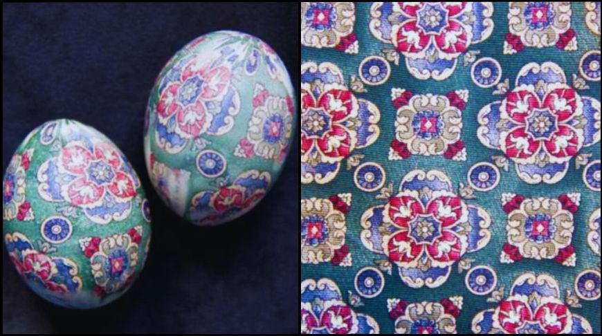 Используйте старый шелковый галстук или платок для создания уникальных узоров на яйцах. Оберните яйцо кусочком шелка так, чтобы он плотно прилегал к нему. Затем обмотайте яйцо прочной тканью и сварите в воде с добавлением уксуса. После высыхания вы получите удивительные шелковые узоры.Эффект омбре