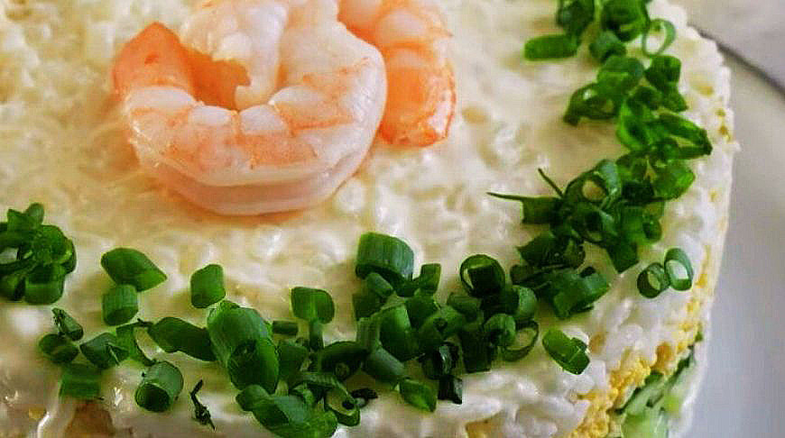 Можно переходить к сборке салата. Рекомендуется использовать кольцо для красивой подачи. Половину готового риса следует аккуратно распределить первым слоем в кольце на блюде. Этот слой нужно смазать сливочным сыром с мягкой текстурой, чтобы придать блюду нежность. Поверх него нужно выложить креветки, а на них - огурцы. Затем добавить отварные яйца и смазать их сливочным сыром. Завершающий слой - вторая порция риса, которую также следует хорошо смазать сливочным сыром.