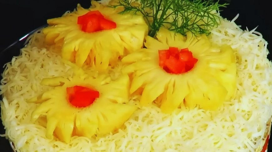 Готовому салату дают настояться в холодильнике несколько часов для пропитки. Салат подают, украсив кусочками ананаса, помидорами и зеленью, например укропом. Блюдо получается свежим и нежным благодаря сочетанию сочных ананасов, мягкой курицы и орехов.