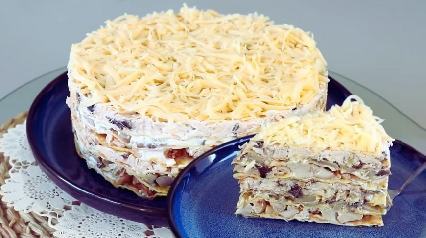 Собирают в форме: каждый круг лаваша смазывают соусом. Чередуют слои: курица - соус; грибы - соус; сырная начинка - соус (повторяют дважды). Верх посыпают натертым сыром. Накрывают пленкой, охлаждают в холодильнике минимум час (лучше ночь). Перед подачей аккуратно снимают форму.